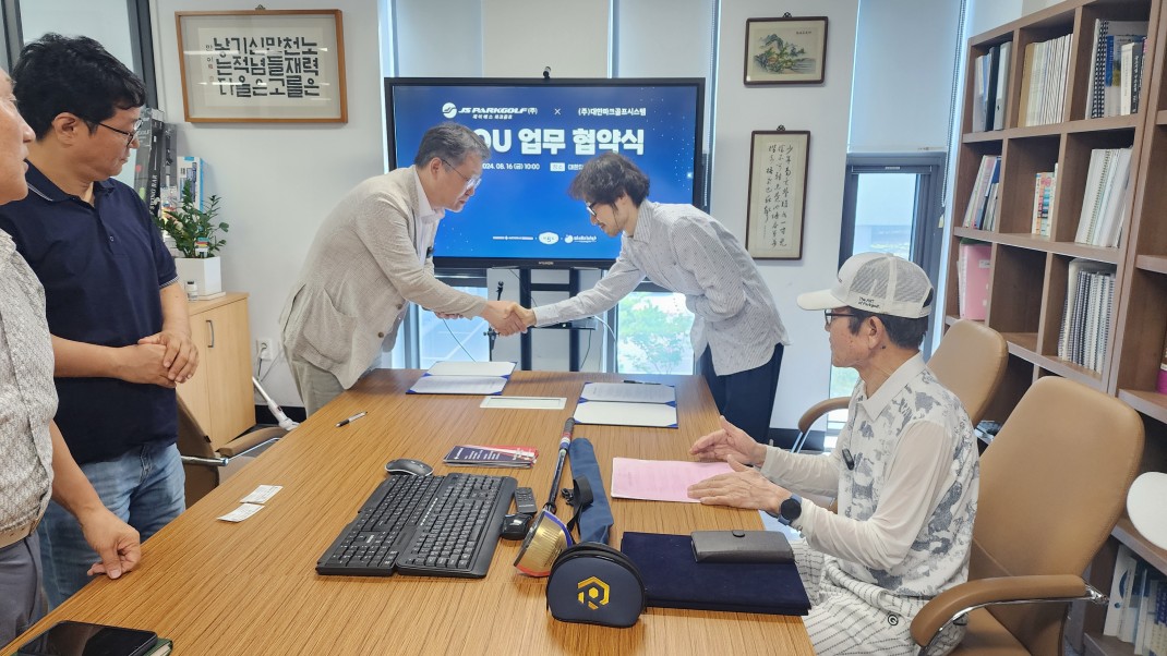 대구시 수성구 알파시티에 위치한 대한파크골프시스템 본사 회의실에서 양사간의 MOU(업무협약)을
